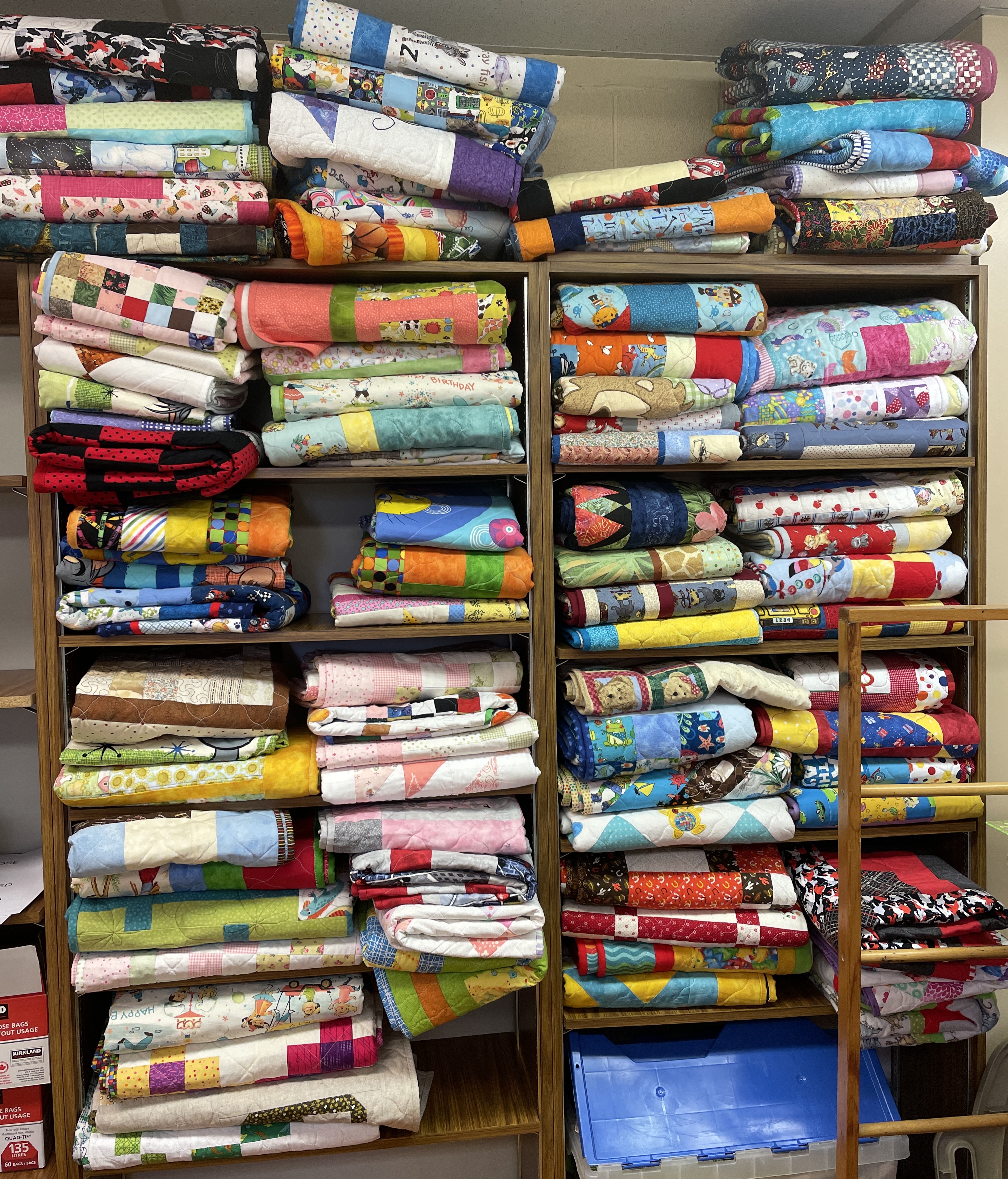 The shelves at Maryvale are empty. Mary and Corinne have bundled up the quilts for distribution to Cardinal Place, Windsor Essex Child/Youth Advocacy Centre, Children’s Aid Society, Angela Rose House, Building Blocks for Better Babies, and Journey Home Hospice.