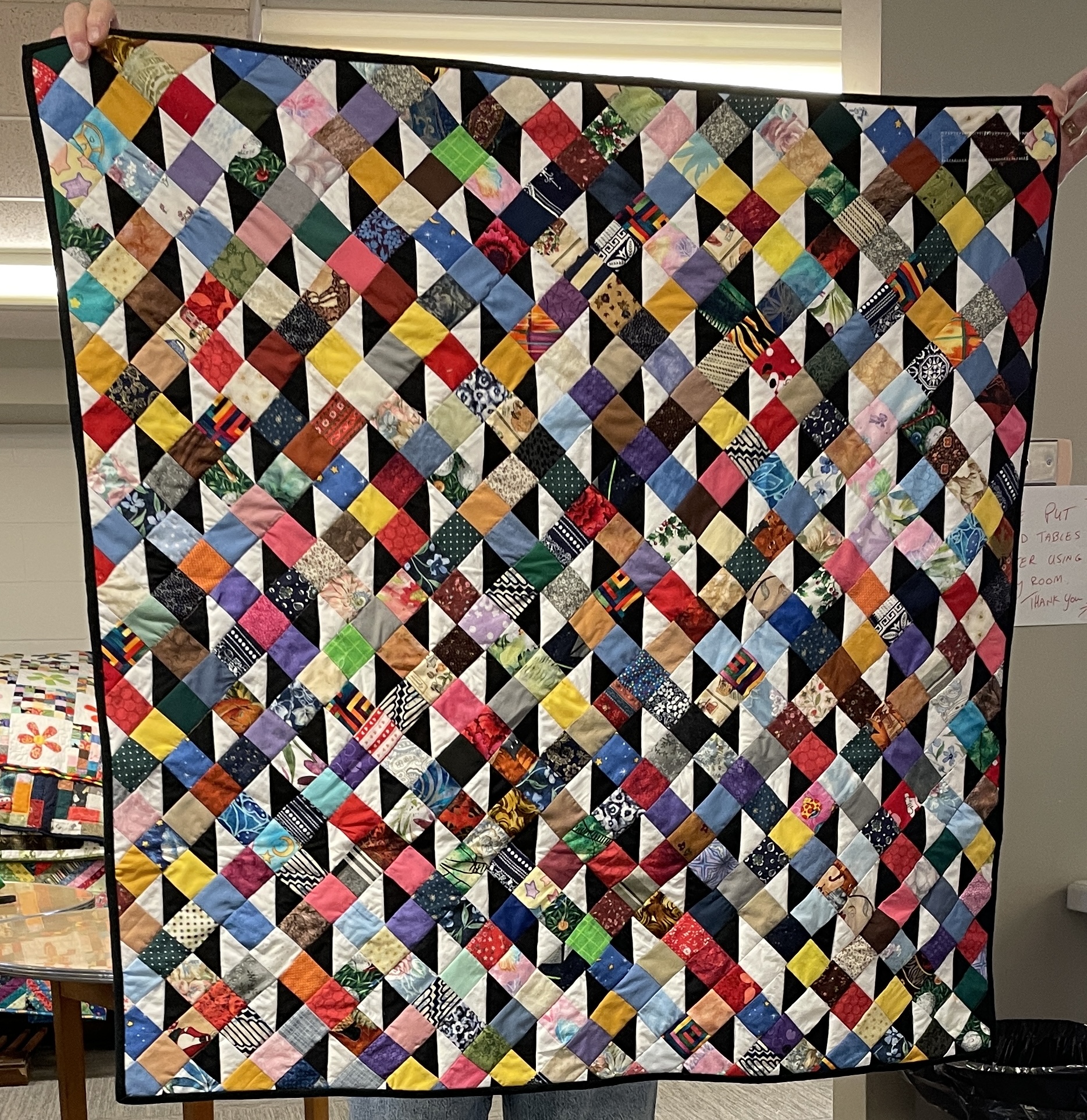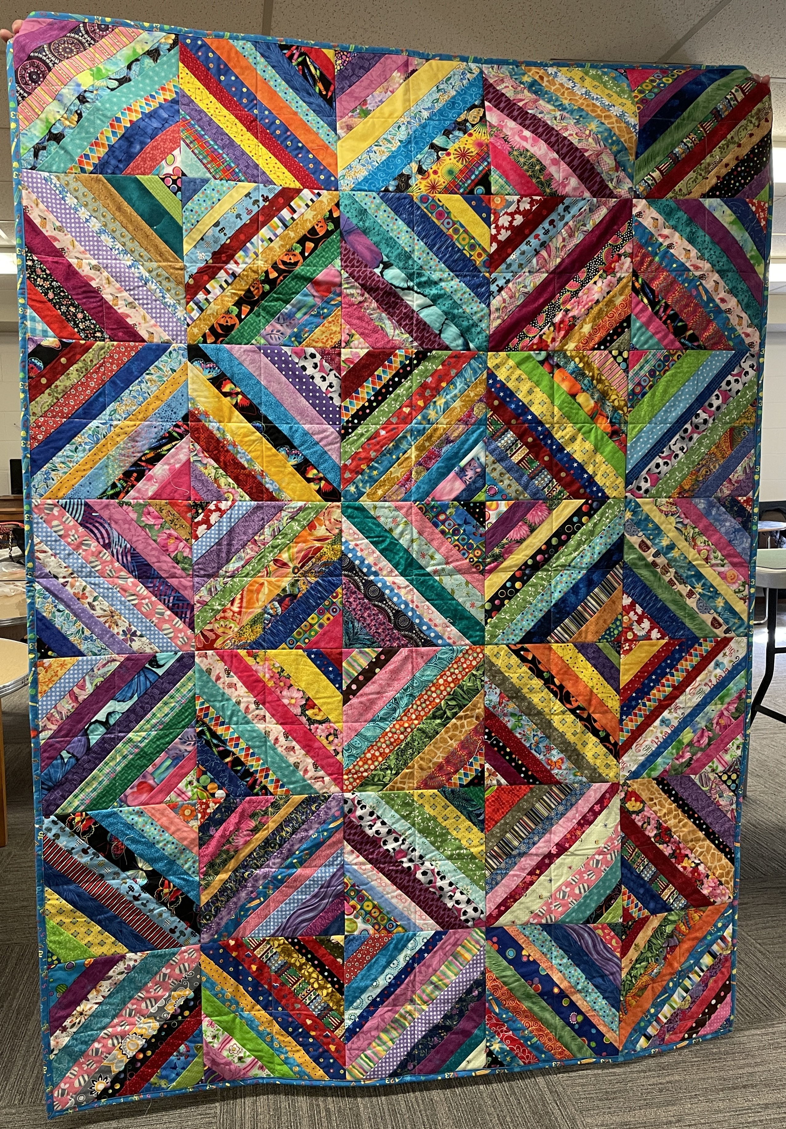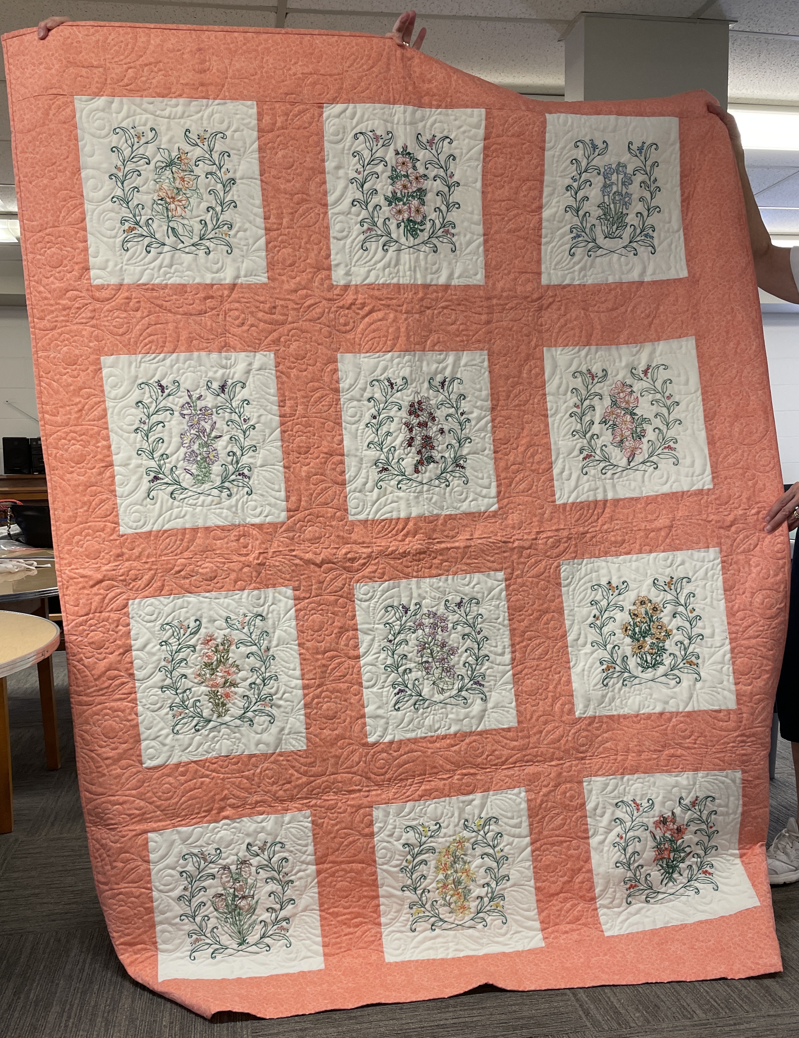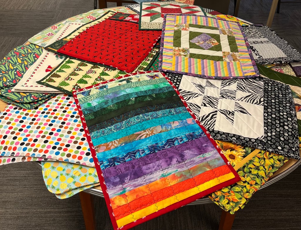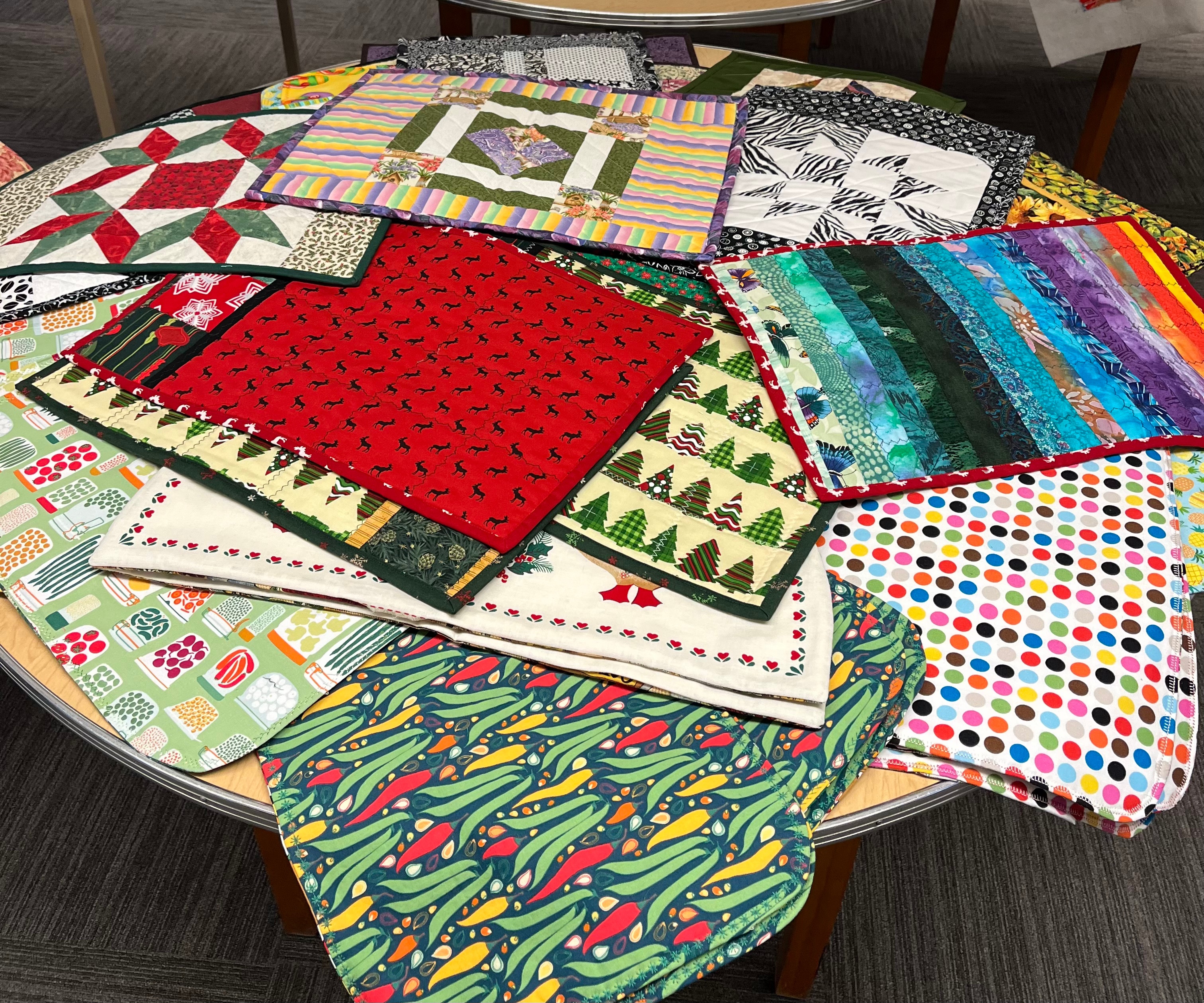 At today’s Sit ‘n’ Sew we had quite a show and tell. Thirty-four quilts were displayed and almost 90 placemats. Our shelves are filling up. Thank you to all who contribute their time, talent and fabrics to our Comfort Quilts.