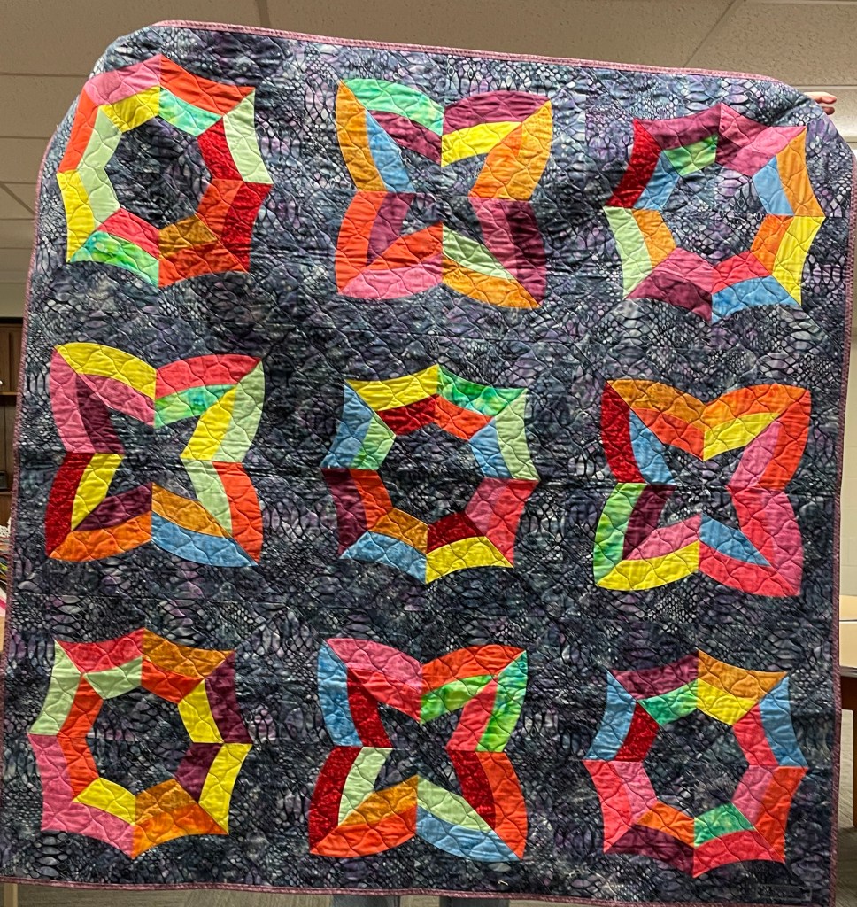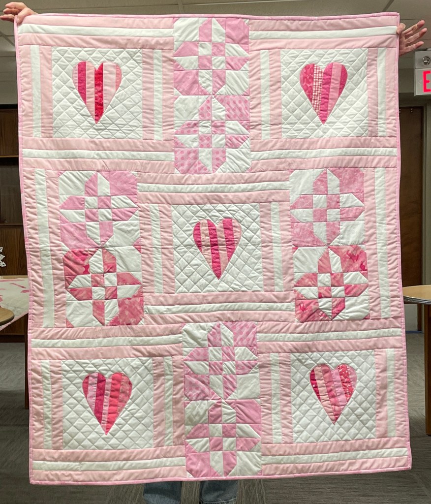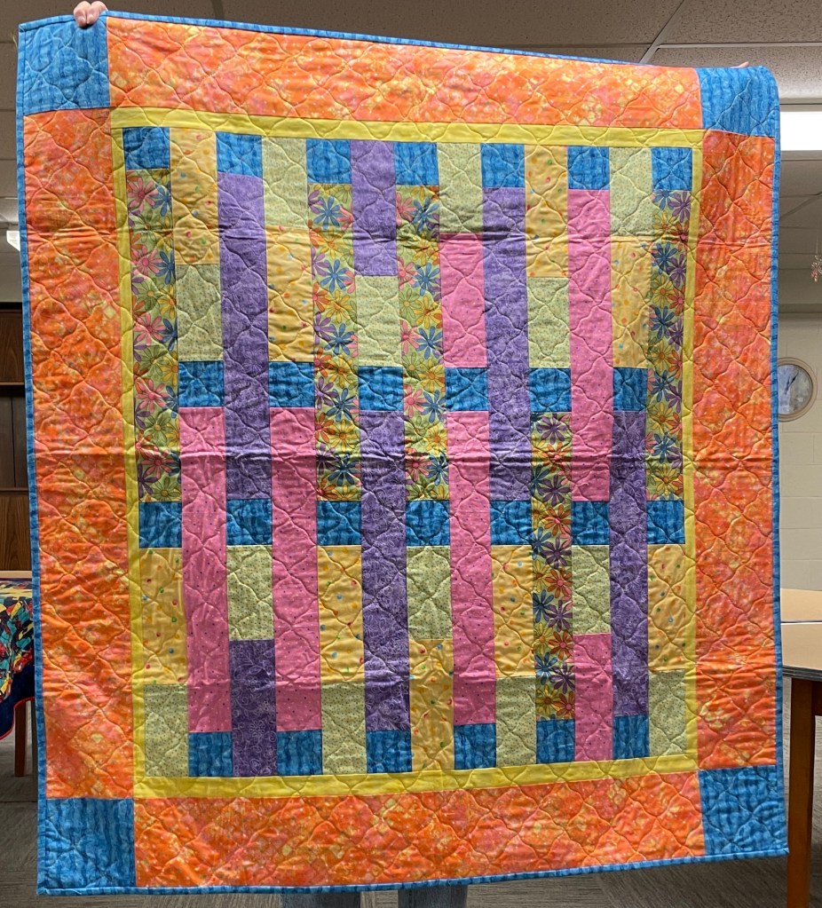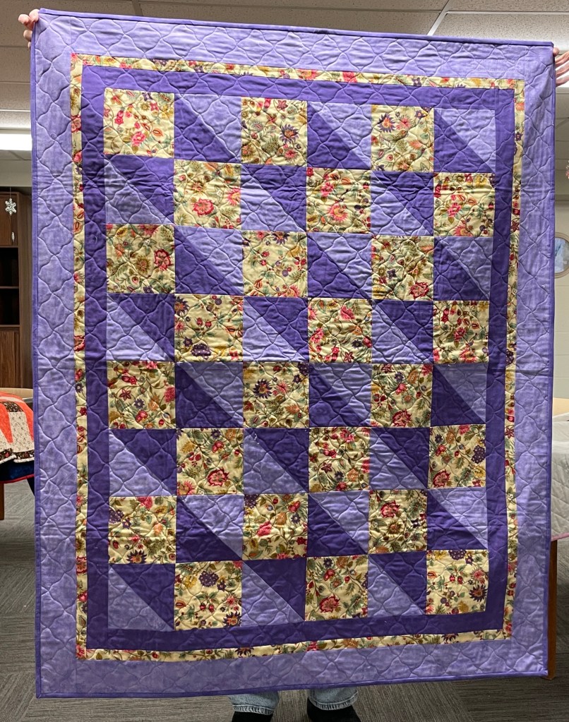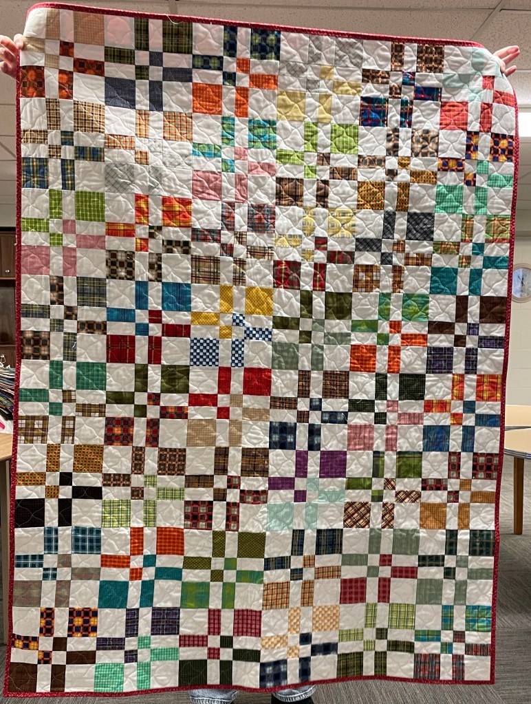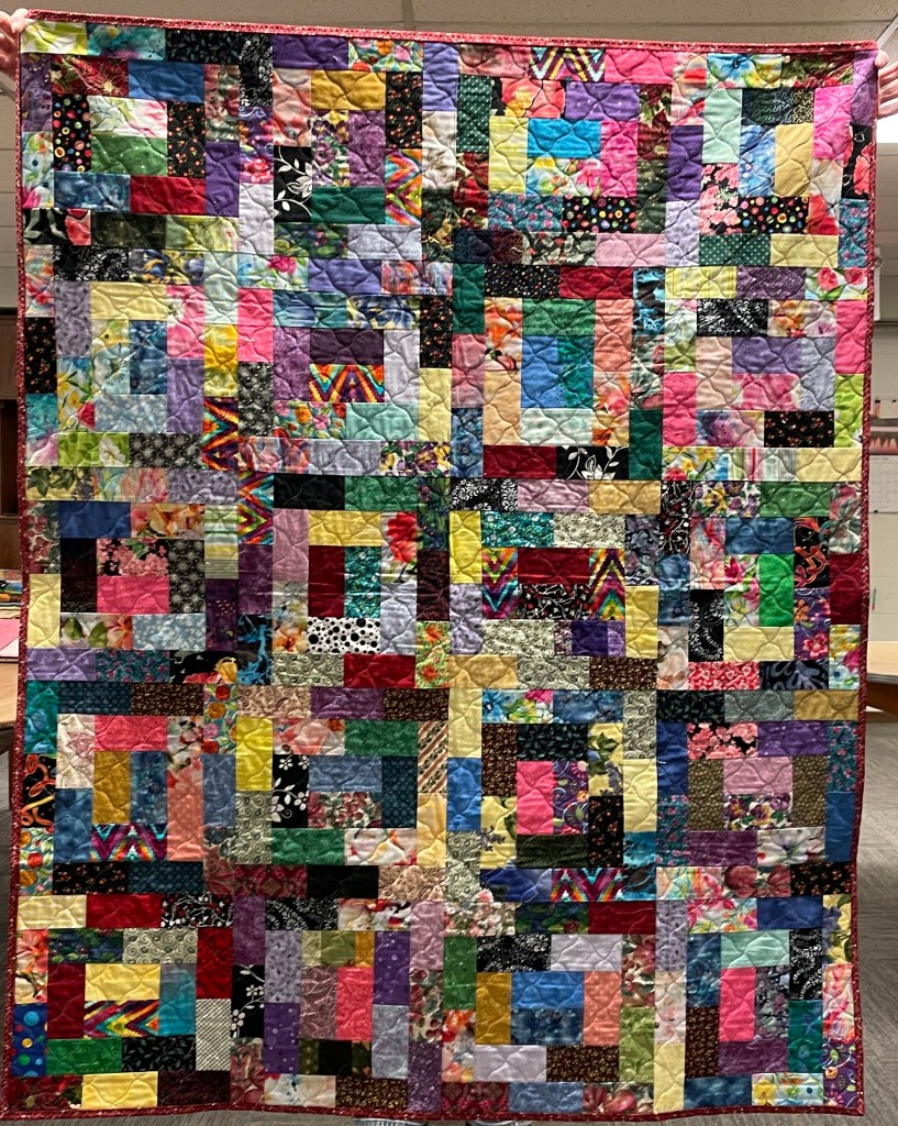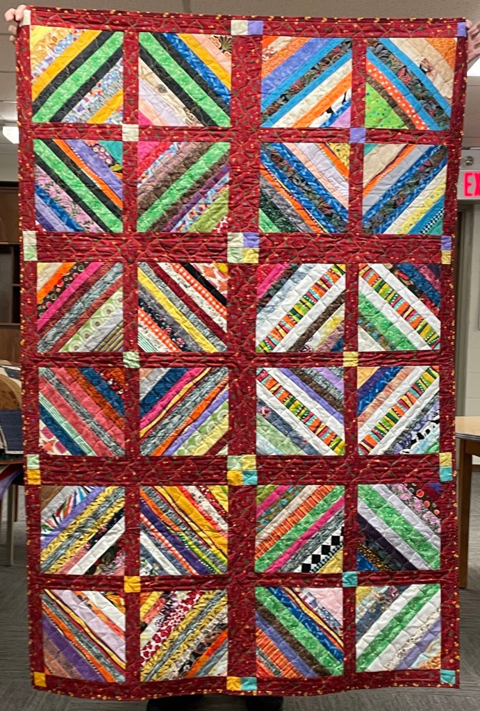 Our guild’s Comfort Quilts committee hosts a Sit ‘n’ Sew every 2nd and 4th Tuesday of the month at Maryvale in west Windsor. Today a number of volunteers gathered to work on comfort quilts. These same volunteers brought in what they had completed recently. To say they have been very busy lately is an understatement. The 41 quilts below are the ones turned in today. Most were made and/or finished by them. Some were donated by others at our last guild meeting. We are off to a good start in 2026!