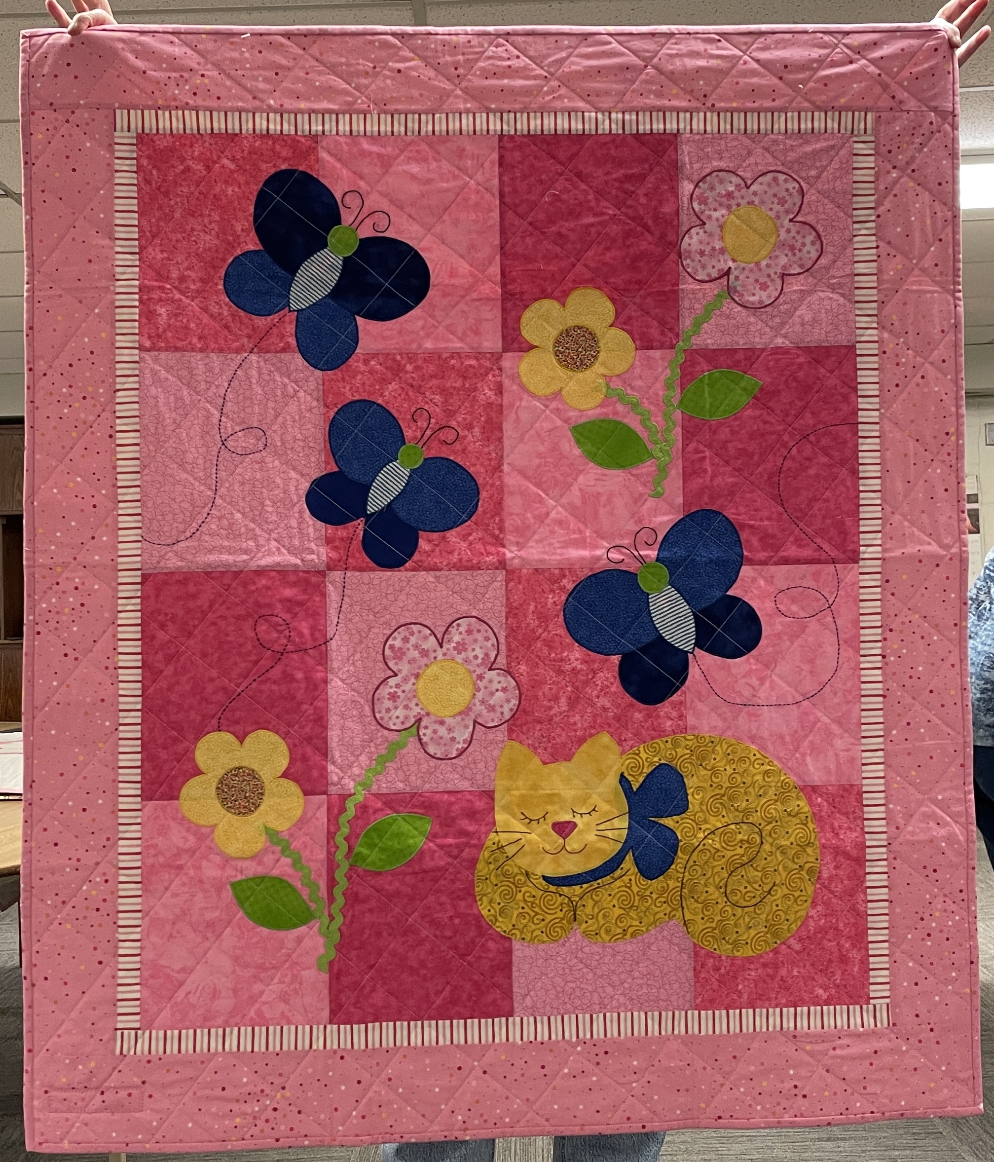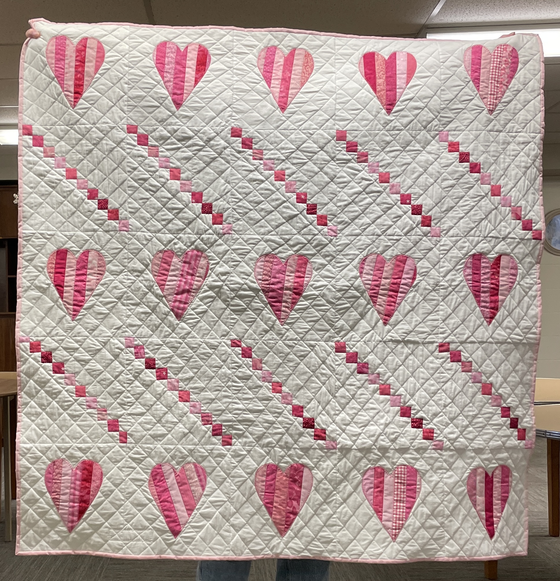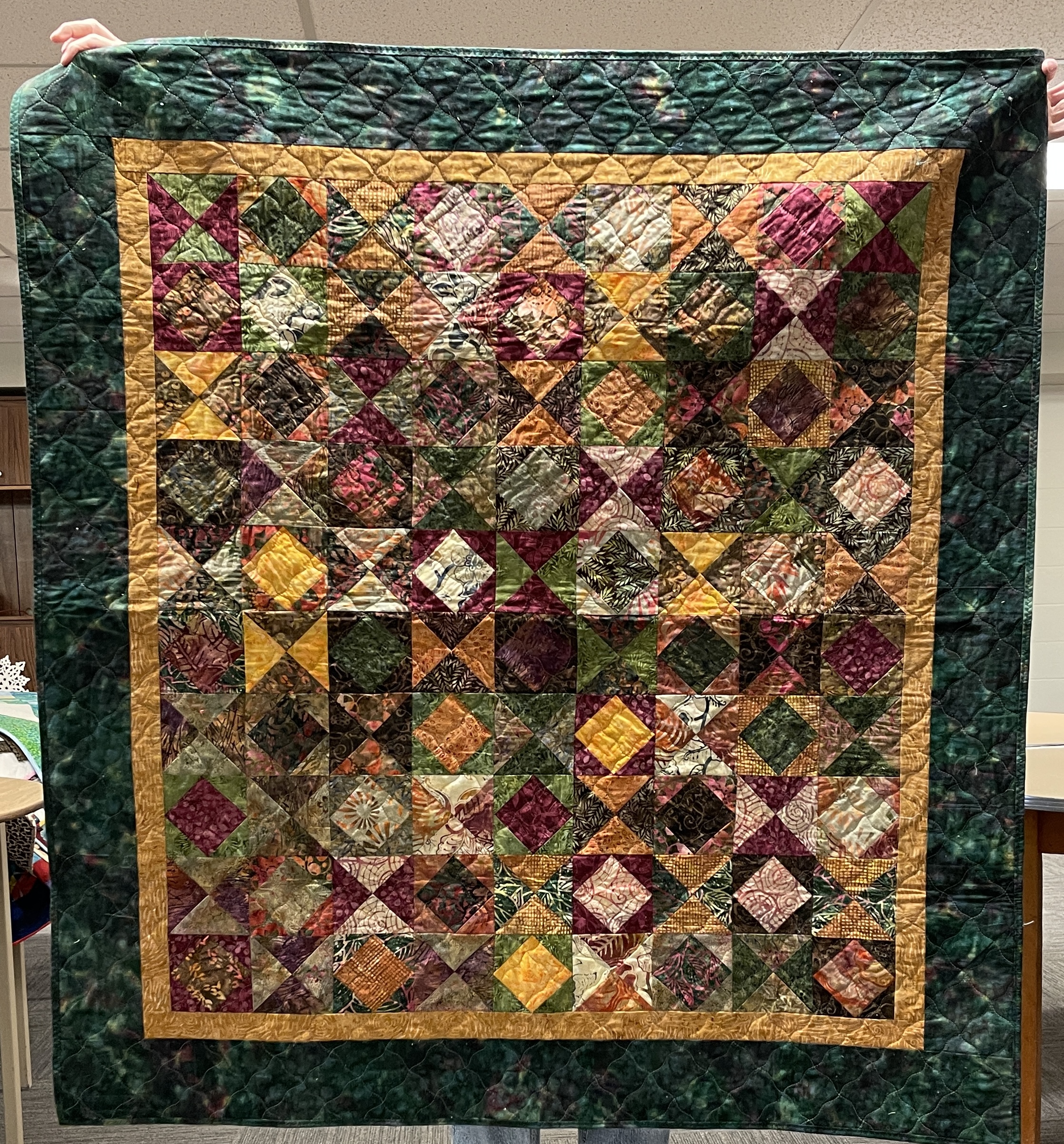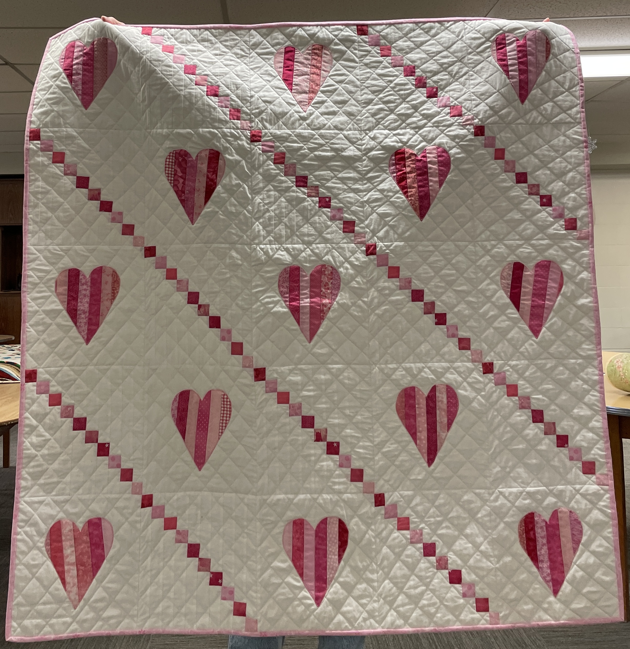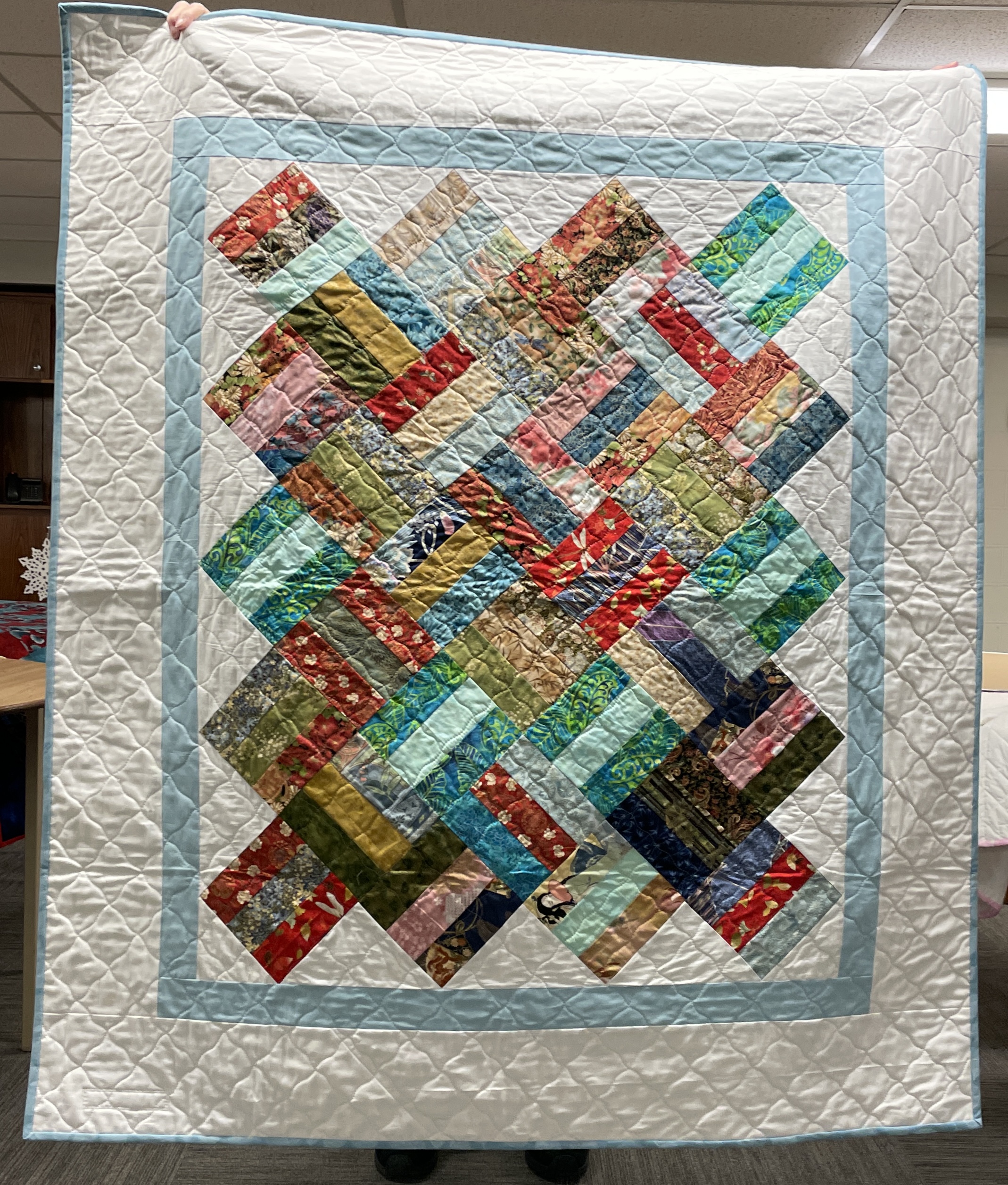 Our guild’s Comfort Quilts committee hosts a Sit ‘n’ Sew every 2nd and 4th Tuesday of the month at Maryvale in west Windsor. Today a number of volunteers gathered to work on comfort quilts. These same volunteers brought in what they had completed recently. To say they have been very busy lately is an understatement. The 41 quilts below are the ones turned in today. Most were made and/or finished by them. Some were donated by others at our last guild meeting. We are off to a good start in 2026!